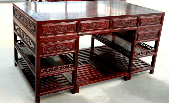 江蘇中尊木業(yè)有限公司書(shū)房系列產(chǎn)品:書(shū)房五件套草龍書(shū)柜、草龍大班枱、卷書(shū)寶座椅,洋花寫(xiě)字枱等。